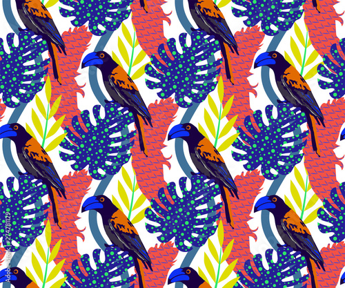 Tropical wildlife, bird seamless pattern. Hand Drawn jungle nature, flowers illustration. Print for textile, cloth, wallpaper, scrapbooking