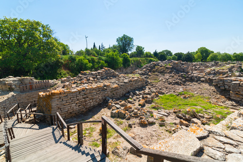 Troy ancient city ruins view. Visit Turkiye concept background