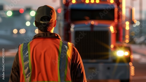 Truck Driver in Safety Vest Looking at Semi Truck at Dusk