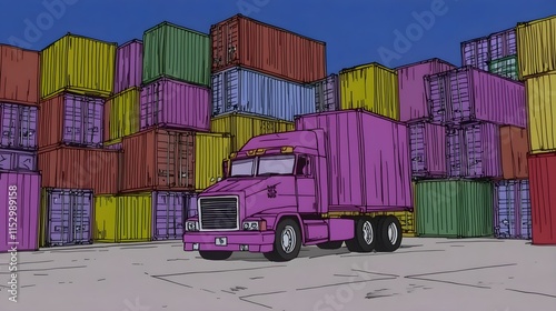Truck transporting freight in colorful warehouse animated scene urban environment