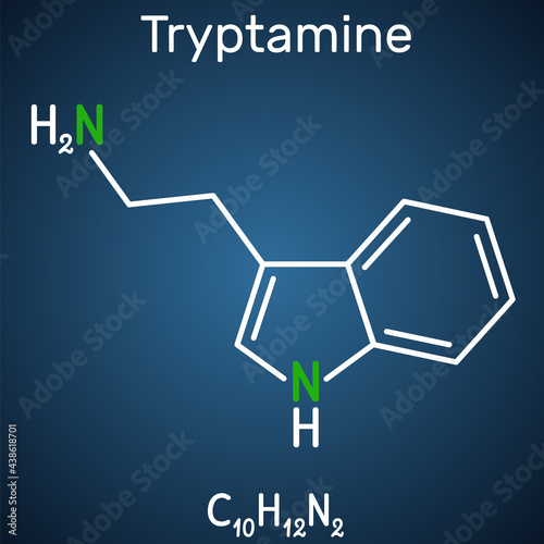 Tryptamine molecule. It is alkaloid, aminoalkylindole. Structural chemical formula on the dark blue background