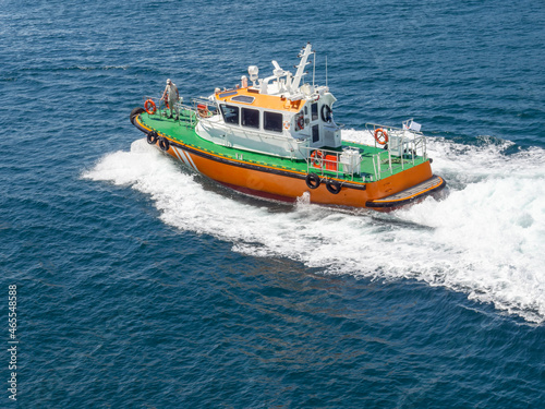 Tugboat towing vessel sails at maximum speed and makes waves in sea. Marine Navigation in the seaport