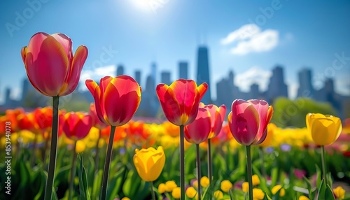 Tulips in front of a city skyline, clear sky, vibrant colors, lowangle shot