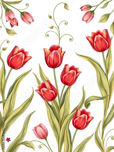 Tulips Seamless Floral Pattern with Red Flowers