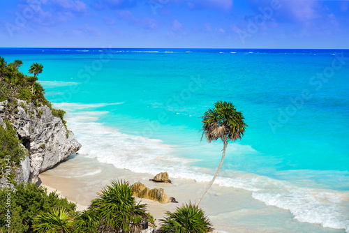 Tulum turquoise beach palm tree in Riviera Maya at Mayan