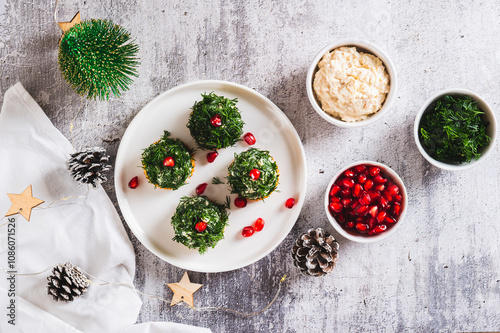 Tuna, egg and dill salad shaped like Christmas trees on crackers on a plate top view
