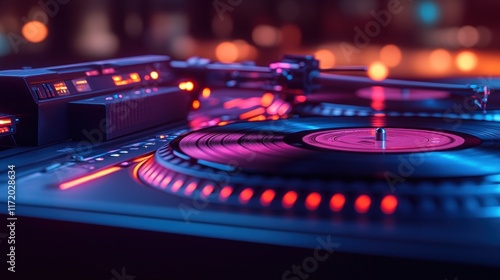 Turntable illuminated with vibrant neon lights.
