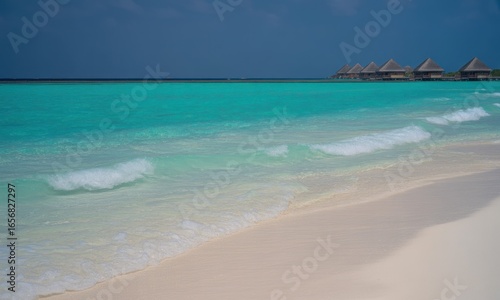 Turquoise water lapping at a sandy shore, thatched bungalows in the distance