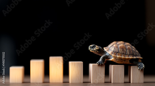 Turtle climbing wooden blocks, symbolizing slow and steady progress, gradual growth, and achieving goals through persistence and determination.