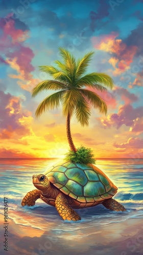 Turtle with a palm tree on its shell during sunset
