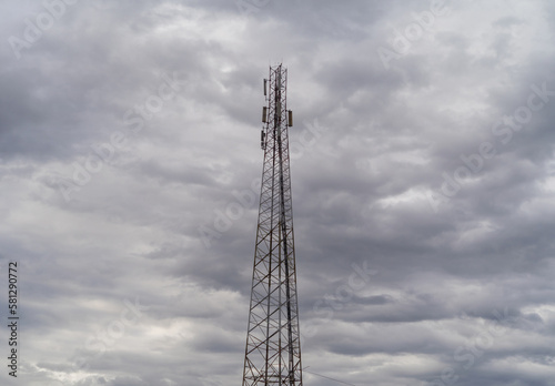 TV radio antenna network telecom tower isolated on sky. Station