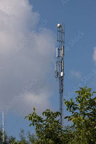 TV tower, mobile phone tower over countryside on sky background