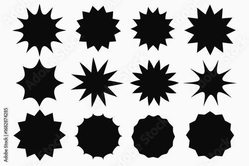 Twelve Black Burst Shapes on a White Background Displaying Diverse Designs