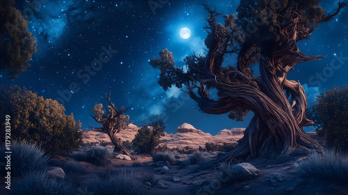 Twisted juniper trees on moonlit desert plateau
