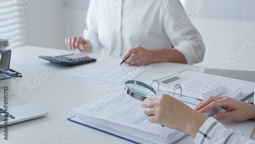 Two accountants are working together, using a magnifying glass and a calculator, to audit financial reports in their brightly lit office. Audit and taxes in business