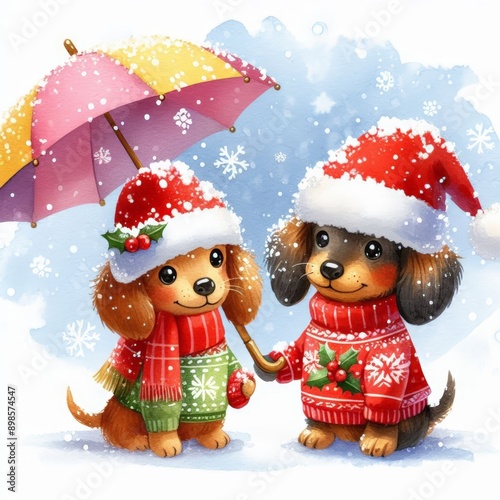 Two adorable dachshund puppies in Christmas hats and sweaters stand under an umbrella in a snowy winter scene.