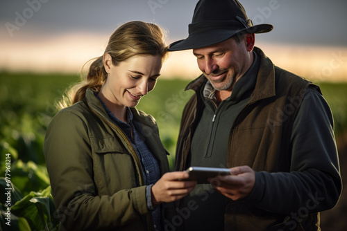 two agriculturals working in a field with a tablet bokeh style background