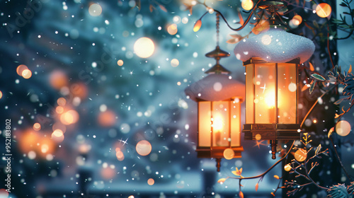 Two antique lanterns are hanging from a snow-covered branch, illuminating the falling snow on a cold winter night