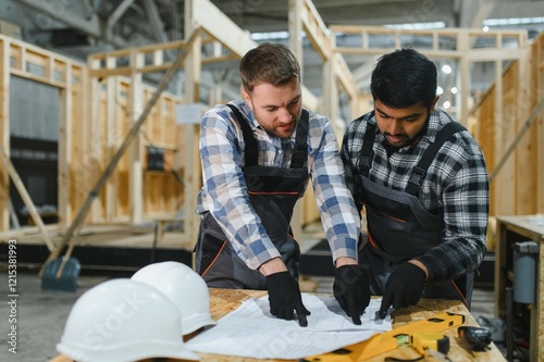 Two architects are looking at a construction plan drawing or blueprint. Construction process