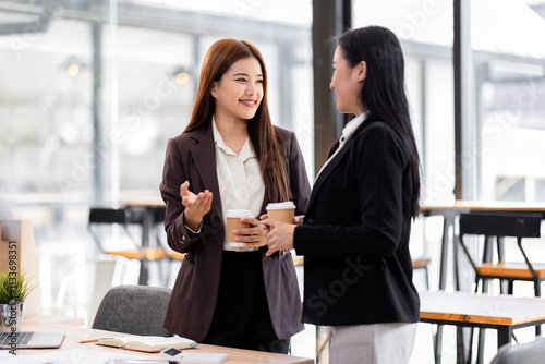 Two asian business women discuss data on document graph report. Meeting and Talking.advising each other in office,
