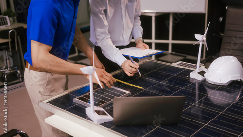 Two Asian businessmen wearing engineer hats table, discussing solar panels and wind turbines. They plan environmental projects, focusing on solar energy solutions and renewable energy installations