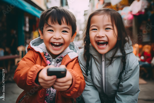 Two Asian kids, engaged and playful, manipulating a smartphone.