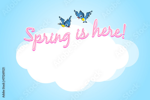 Two birds with lettering Spring is here and copy space cloud for your custom text