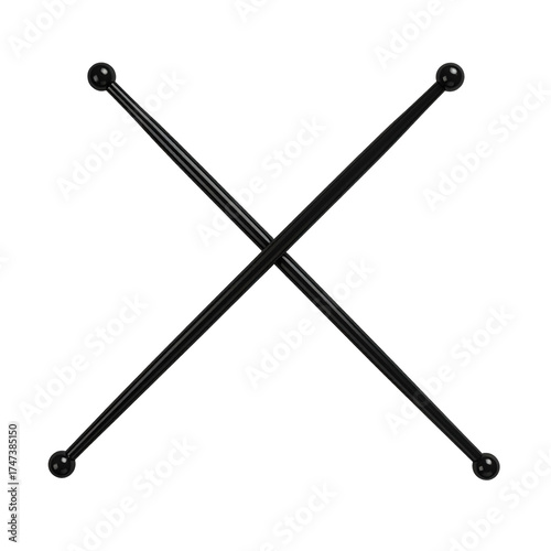 Two black, crossed sticks with rounded ends, set against a stark black background