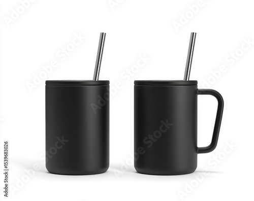 Two black mugs with metal straws and lids, side-by-side on a white background