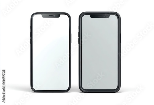Two black smartphones with blank screens, side-by-side against a white background