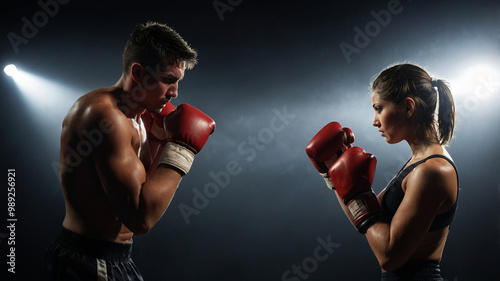 Two boxers face off under bright lights