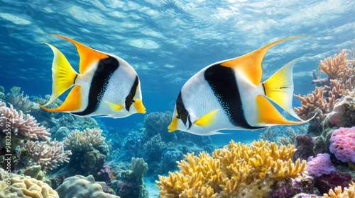 Two bright fish Moorish idols gracefully glide through a lively coral reef teeming with diverse marine life under the sunlit ocean surface