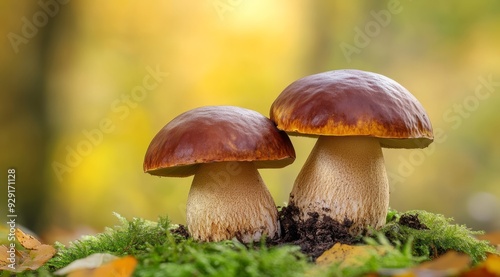 Two bright mushrooms rest on lush moss, showcasing natures beauty during the enchanting fall season