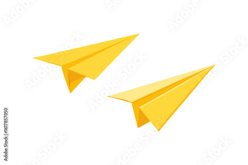 Two bright yellow paper airplanes flying against a solid black background