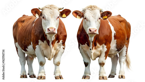 Two Brown and White Cows Standing Side by Side on Transparent Background