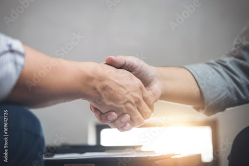 Two business men shaking hands during a meeting to sign agreement and become a business partner, enterprises, companies, confident, success dealing, contract between their firms