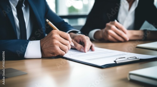 Two business professionals in a formal setting, discussing a document on a clipboard.