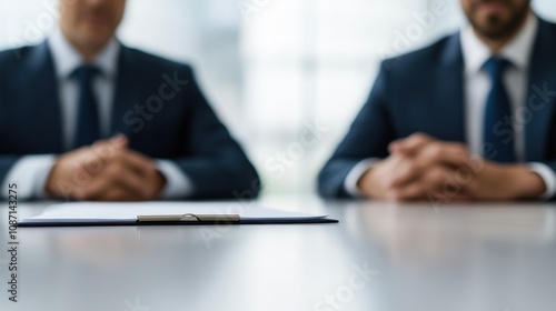 Two business professionals in suits are seated at a table, hands clasped, with a document in focus, suggesting a meeting or negotiation.