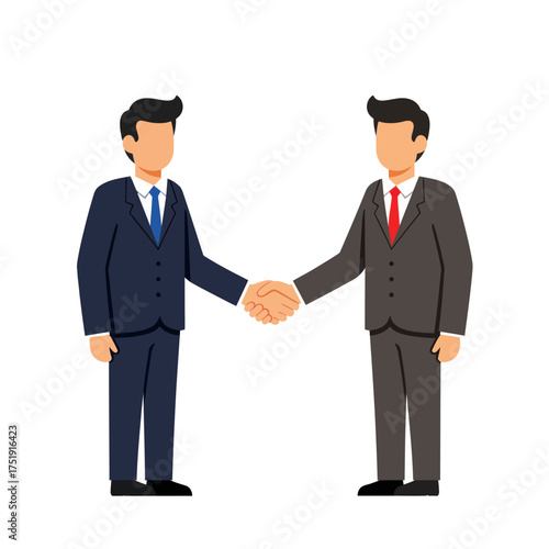 Two businessmen in formal suits shaking hands in agreement.
