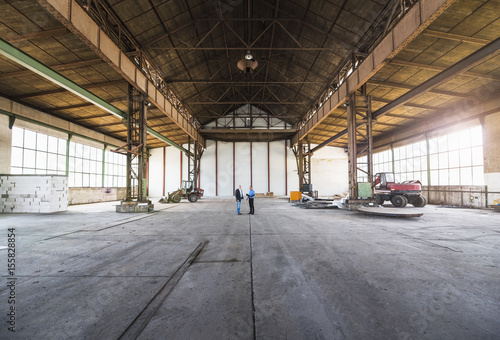 Two businessmen with documents talking in old industrial hall