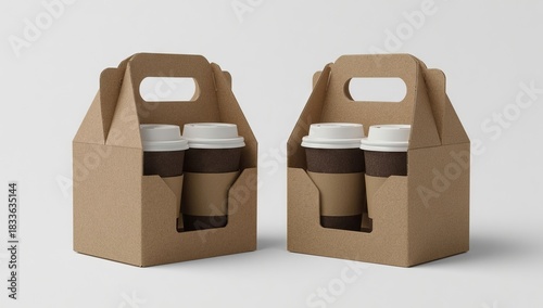 Two cardboard carriers, each holding two disposable coffee cups with white lids and brown sleeves, sit on a neutral surface, creating a simple and clean arrangement, promoting the concept of takeaway.