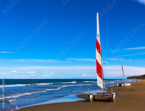 Two catamarans with red and white sails, standing on the sand of the beach of greece, at the western peloppones. Coastline and shore with the waves of the sea in the background. tourism picture.