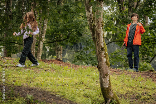 Two children explore a forested park, with one walking and the other smiling at the camera. The ground is grassy and slightly sloped with tree cover.