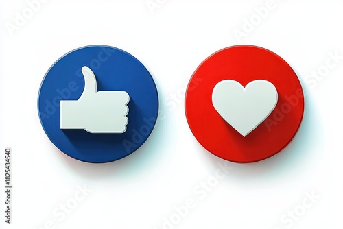 Two circular buttons with thumb-up icon on a blue background and heart icon on a red background casting long shadows on white surface conveying approval and love emotions