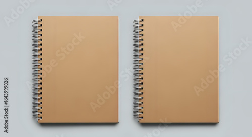 Two closed spiral notebooks with tan covers placed on a light gray surface in a studio setting