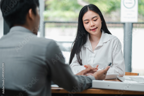 Two colleagues engaged in a discussion during a business meeting in a modern office environment.