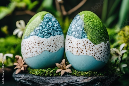 Two colorful eggs on a mossy rock surrounded by vibrant flowers, celebrating Easter's beauty.