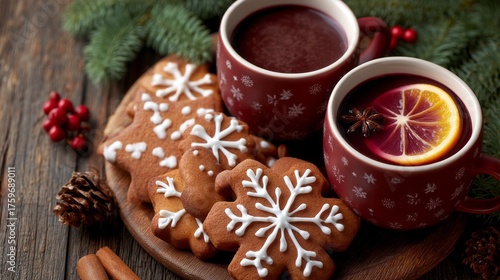 Two cups filled with rich, spiced beverages sit beside beautifully decorated gingerbread cookies. Pine branches and festive elements surround this warm winter arrangement