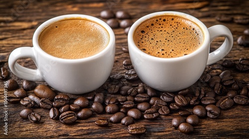 Two cups of coffee surrounded by coffee beans on a wooden surface.