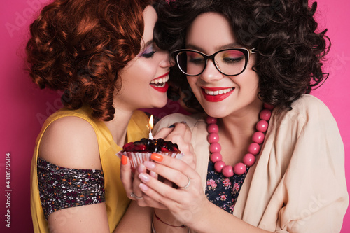 Two cute girl friends woman looking like nerd accountants standing on a pink background. They wear curly brunette wigs and unstylish retro casual outfits. Berry cupcake with candle in their hands.